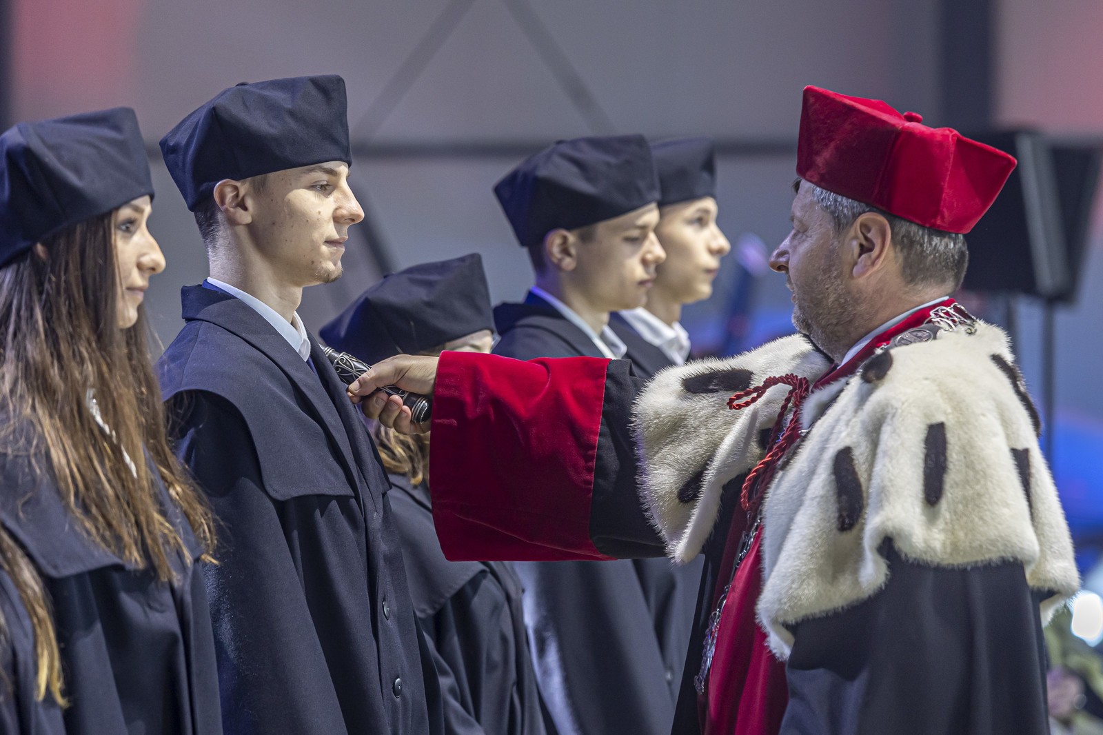 Ważną częścią uroczystości było ślubowanie przedstawicieli studentów pierwszego roku, które poprowadziła prorektor ds. kształcenia dr hab. Iwona Włoch, prof. PRz, oraz przedstawicielki doktorantów Szkoły Doktorskiej Nauk Inżynieryjno-Technicznych PRz, które poprowadził prorektor ds. nauki dr hab. inż. Lesław Gniewek, prof. PRz. JM Rektor dokonał pasowania studentów i doktorantów.