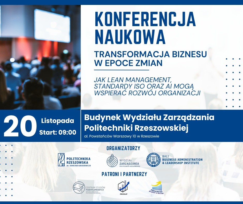 BALI BUSINESS ADMINISTRATION & LEADERSHIP INSTITUTE, Stowarzyszenie Absolwentów MBA Politechniki Rzeszowskiej oraz Wydział Zarządzania Politechniki Rzeszowskiej zapraszają na pierwszą edycję konferencji „Transformacja Biznesu w Epoce Zmian”, która odbędzie się 20 listopada br. O godz. 9.00 na Wydziale Zarządzania Politechniki Rzeszowskiej, al. Powstańców Warszawy 10 w Rzeszowie. Wstęp bezpłatny, a liczba miejsc jest ograniczona.